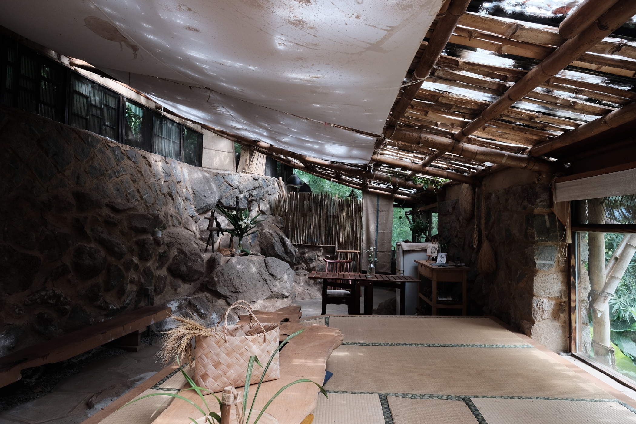 ポリカの屋根を透かして落ちる光と斜面に積んだ石の壁によって,力強さと揺らぎのある優しさという相反する質感が共存する空間となっています.畳は光を美しく受け止めるのに適したマテリアルです.