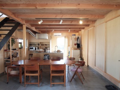 一階ダイニング+ホールは土間空間とし,外部と連続するラフな使い方ができるスペースとした.ダイニングに隣接する一階予備室と二階はフローリング張りとして,リラックスできるスペースとした.