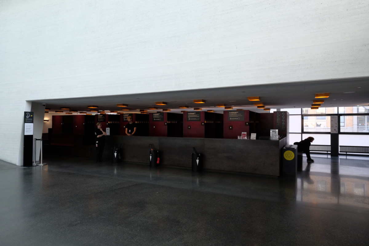 入って右手にチケットを購入できるカウンターとロッカー,左手にミュージアムショップとカフェ.