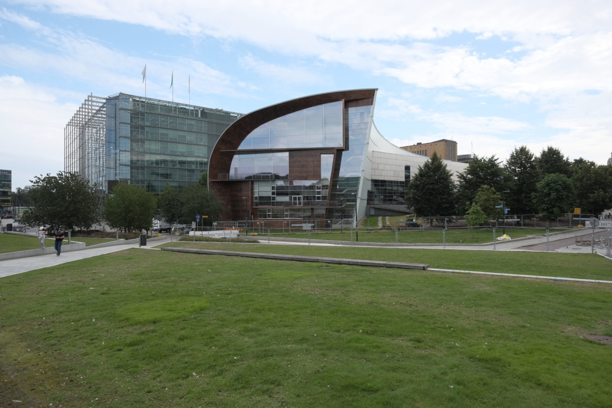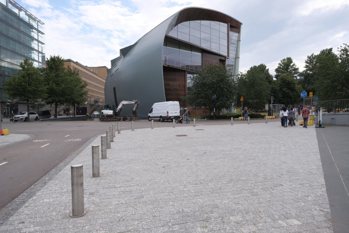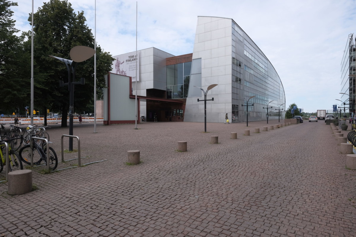 ヘルシンキ中央駅の徒歩圏内,大通りに面して緩やかなカーブを描いて佇むアイコニックな建築は,メカニカルでありながら有機的な独特の外観.