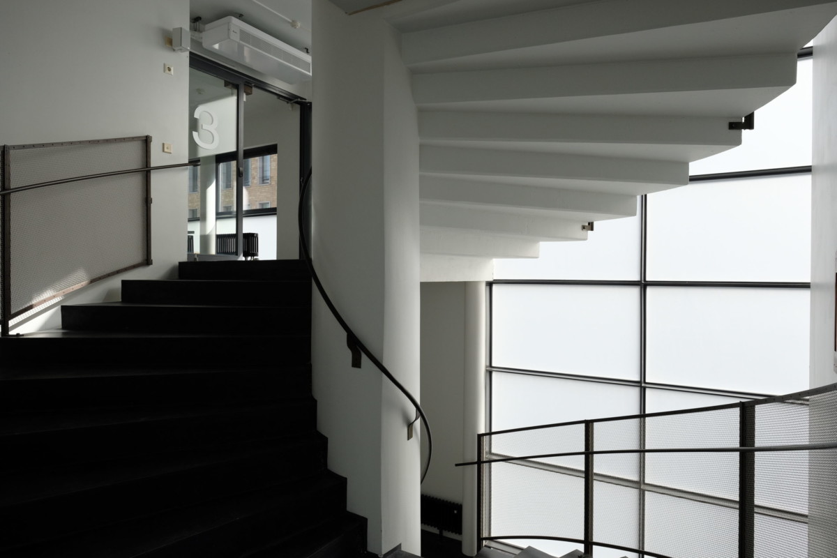 スロープを上るとダイナミックに階段が宙を舞う階段室に出ます.